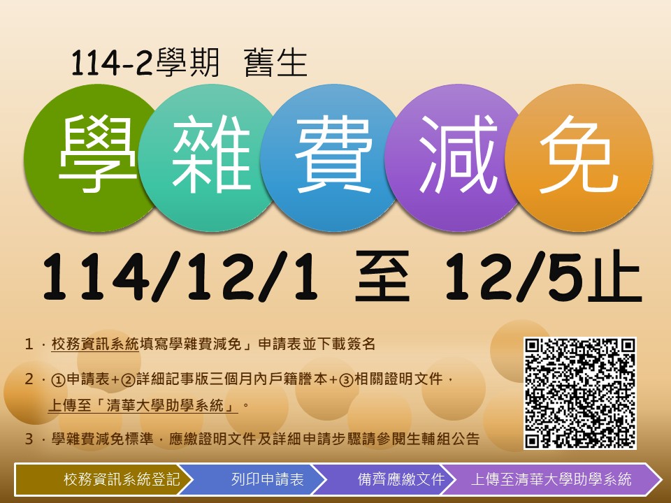 【學雜費減免】114-2學雜費減免受理期間自114/12/1~12/5止