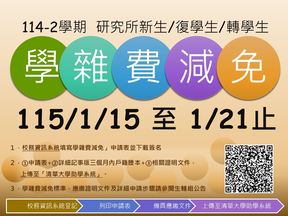 【研究所新生/復學生/轉學生學雜費減免】114-2學雜費減免受理期間自115/1/15~1/21止